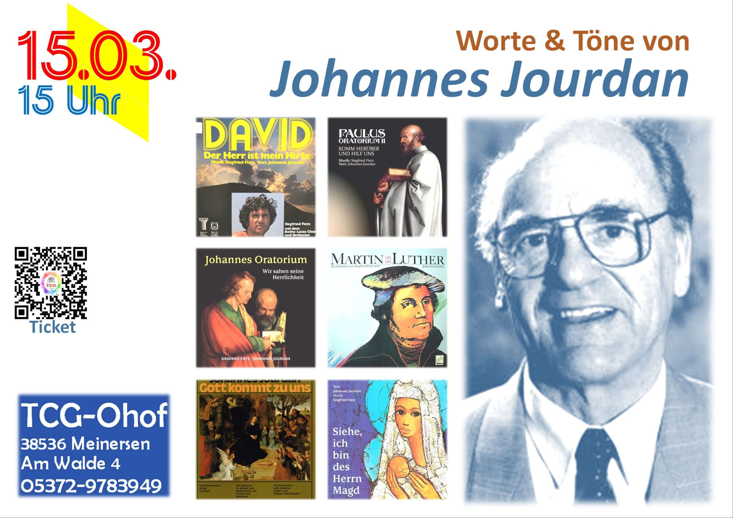 Johannes Jourdan (10.5.1923 – 25.1.2020) war Komponist, Kirchenmusiker und Liedtexter, dessen Werke Generationen von Menschen im Gemeindegesang und in Gottesdiensten begleitet haben. Seine Lieder zeichnen sich durch eine besondere Mischung aus spiritueller Tiefe und einfacher Zugänglichkeit aus. Sie schaffen es, Glaube, Hoffnung und Gemeinschaft gleichermaßen zu transportieren. Jourdan hinterlässt ein reiches musikalisches Erbe, das auch heute noch in vielen Gemeinden gesungen wird und Menschen inspiriert.